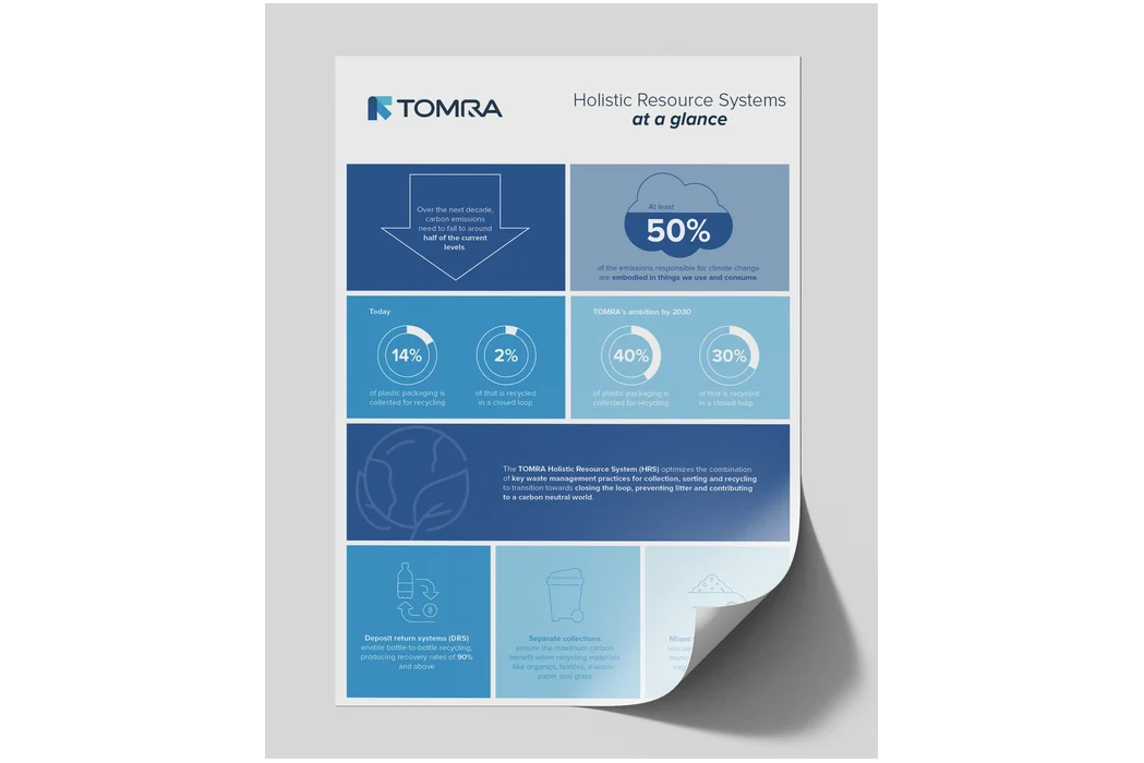 TOMRA is committed to taking post-consumer plastic packaging waste management to a new level worldwide. Having pledged to enable 40 % of all post-consumer plastic packaging produced globally each year to be collected for recycling by 2030, we take our commitment even further. TOMRA also intends to enable 30 % of all post-consumer plastic packaging to be recycled in a closed-loop system in the same timeframe. Additional analysis and case studies on Holistic Resource Systems will be made available in due time.