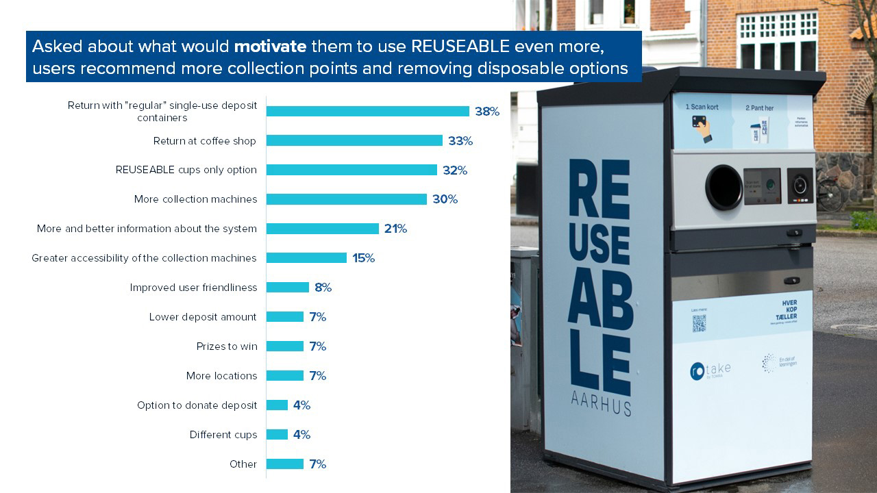 The survey also asked the residents of Aarhus if there were any potential improvements that would motivate them to use the system more. The most important factor cited that would encourage residents who had not yet used the system to do so was adding more collection machines, closer to or at all establishments where the reusable cups are sold.