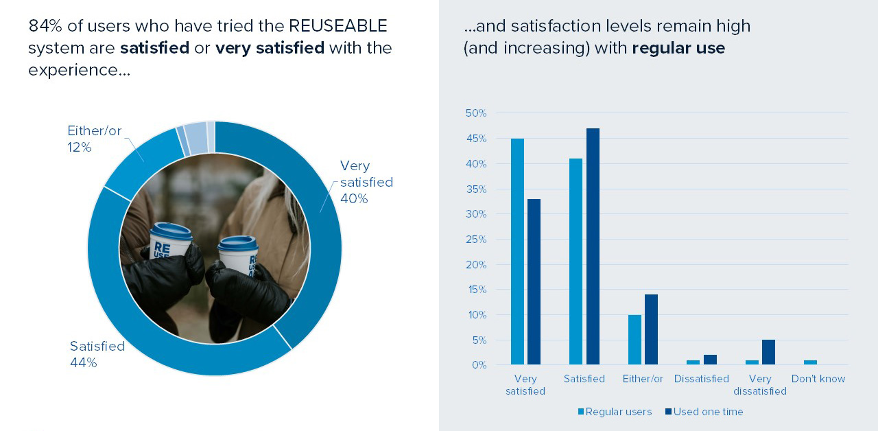 Additionally, the survey shows that residents who use REUSEABLE more than occasionally tend to be more satisfied with the system compared to citizens who have only used the system once or a few times. The tendency for satisfaction to increase the more frequently the system is used suggests that the added effort of returning the packaging to a collection point (compared to disposable packaging) is not in itself a hindrance to successful adoption of the system.