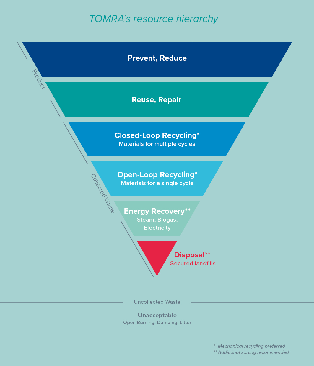 The waste hierarchy is an internationally accepted standard that aims to keep materials at their highest and best use by establishing an order of waste management options from most to least preferred based on the ecological and social impact. TOMRA’s resource hierarchy expanded on this concept to prioritize methods that employ the least carbon-intensive processes and differentiate between open-loop and closed-loop recycling. To ensure materials are continually turned back into new products of the same or similar application, closed-loop recycling systems (e.g., bottle-to-bottle) offer the most sustainable opportunity for increasing circularity beyond reuse.