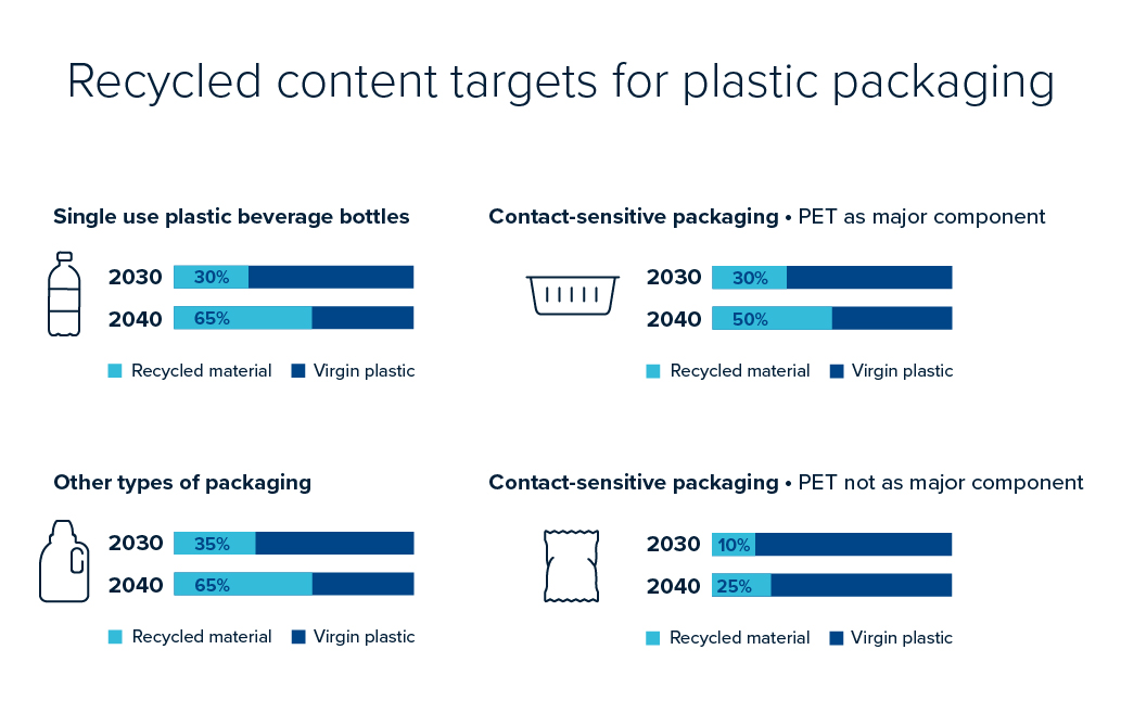 - A beverage bottle which is made from PET, a material that already has well-established recycling processes, might need to meet a 30% recycled content target by 2030, while its cap, made from polyolefins which requires novel recycling processes, would have a separate 10% target.