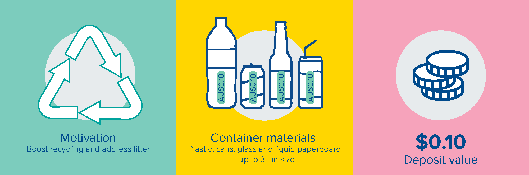 - Beverages: The CDSs all include flavored milk, juice, water, soft drinks / soda, and beer. Typically excluded are spirits, cordial, concentrates, registered health tonics, and plain milk. However, several of Australia’s CDSs currently have proposals to include more types of drinks. - Deposit/refund value: All of Australia’s CDSs currently have a deposit refund value of $AU0.10 for each eligible drink container, but this is under consideration to increase, in order to boost return rates and better align with international best practice.