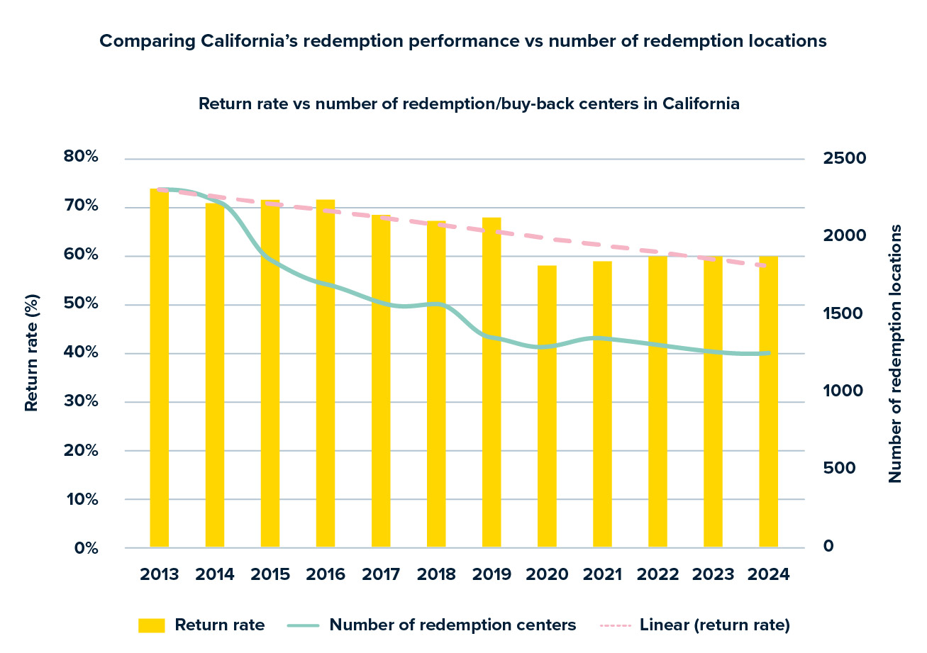 5 “California return rate: "Bottle Bill Resource Guide," Container Recycling Institute. Accessed November 4, 2025. Redemption Locations: "2024 Beverage Container Recycling in California," CalRecycle. 2025.