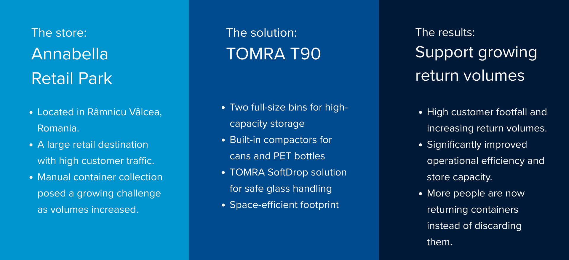 The TOMRA T90 reverse vending machine (RVM) has been successfully introduced at the Annabella Retail Park store in Râmnicu Vâlcea, Romania. With high customer footfall and increasing return volumes, Annabella needed a reliable, high-capacity solution—and TOMRA T90 delivered.