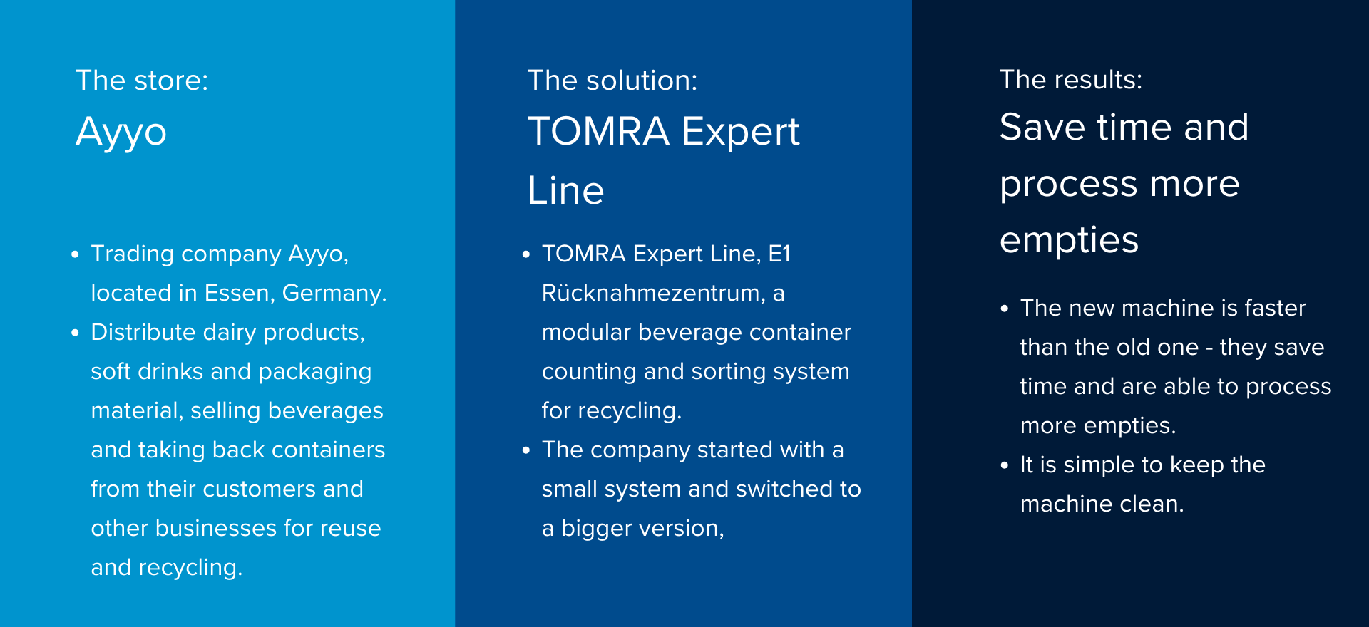 The trading company Ayyo Vertriebs GmbH distribute dairy products, soft drinks and packaging material, selling beverages and taking back containers from their customers and other businesses for reuse and recycling. The company processes 150 000-200 000 beverage containers per week and about 6-7 million containers per year. Today, Ayyo sorts three different materials: aluminum, steel and PET.