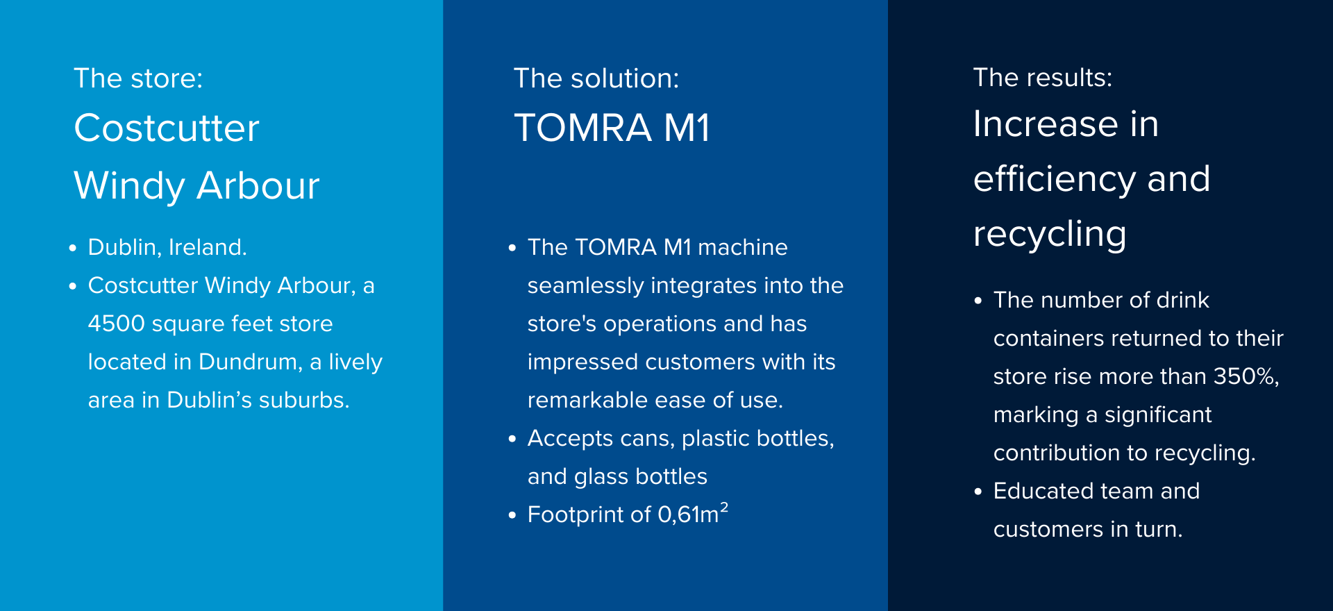 The introduction of the TOMRA M1 at Costcutter Windy Arbour has not only supported in the efficient collection of containers but Aaron believes it will also become a catalyst for attracting more customers to his store. “The [TOMRA] M1 machine is perfect for what we're looking for. It's perfect for our quantity at the moment. And if anything, we'll probably have to expand it in five years,” says Aaron.