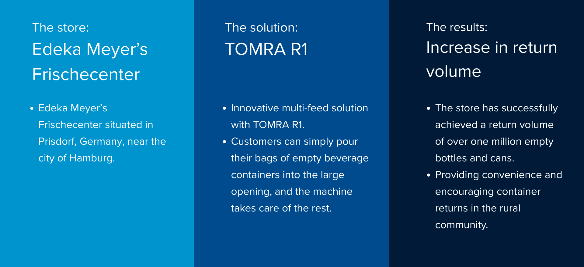 Edeka Meyer's Frischecenter, situated in Prisdorf near the city of Hamburg, Germany,introduced the TOMRA R1 reverse vending system - an innovative multi-feed solution - over a year ago. Customers can simply pour their bags of empty beverage containers into the large opening, and the machine takes care of the rest. This installation has transformed the process of returning empty beverage containers for the store’s customers, providing convenience and encouraging container returns in the rural community of Pinneberg.