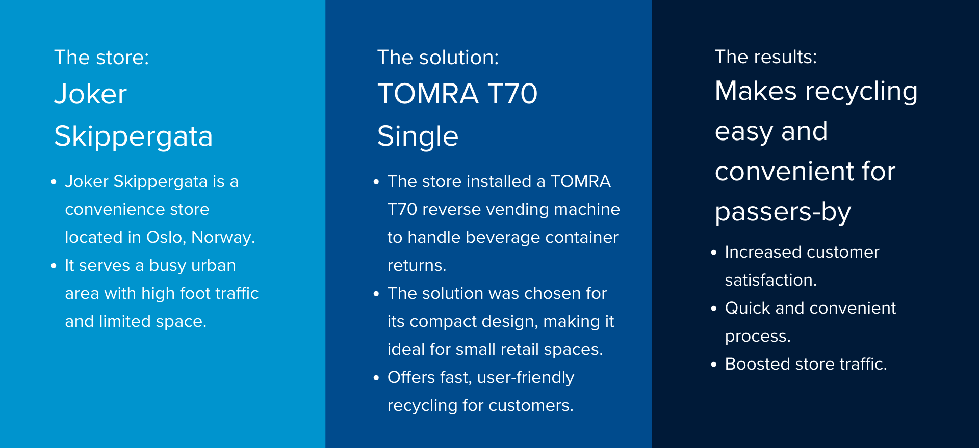 Joker Skippergata, a 24/7 convenience store in Oslo, Norway, took convenience to a whole new level by installing TOMRA T70 Single reverse vending machine (RVM). Since its installation nearly three years ago, the TOMRA T70 Single has proven to be a "dream machine" for the store and recyclers alike.