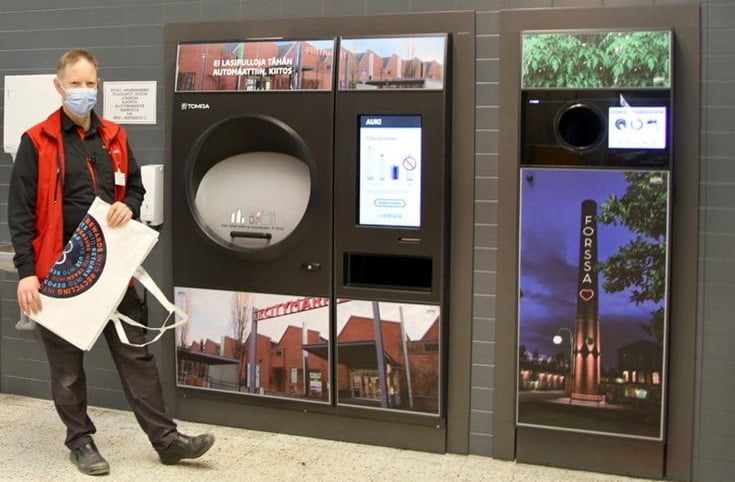In the newly renovated bottle return area of K-Citymarket in Forssa's Kutomo shopping center, two TOMRA T9s and one TOMRA R1 reverse vending machines are ready for use. The reverse vending machines panels have been covered with old-time images reminiscent of the history of Forssa Spinning and Kutomo, giving both the machines and the entire bottle return area a unique appearance.