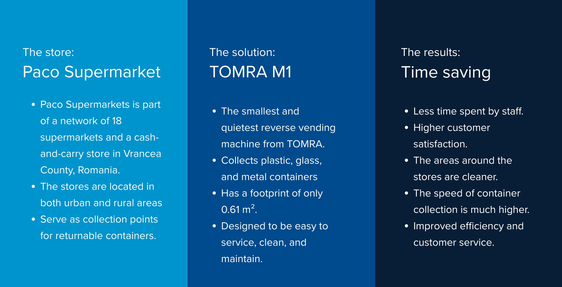Feliciu Paraschiv chose TOMRA's reverse vending machines for their collection of drink containers for recycling because he wanted to work with the best. “In this store, we are currently using an RVM from TOMRA – the TOMRA M1, the smallest system. A small, stylish machine that can be installed inside a store; a machine that doesn’t make noise, is easy to service, easy to clean, doesn’t cause problems, and doesn’t jam. TOMRA M1 is an excellent RVM for a small to medium-sized store,” says Paraschiv.