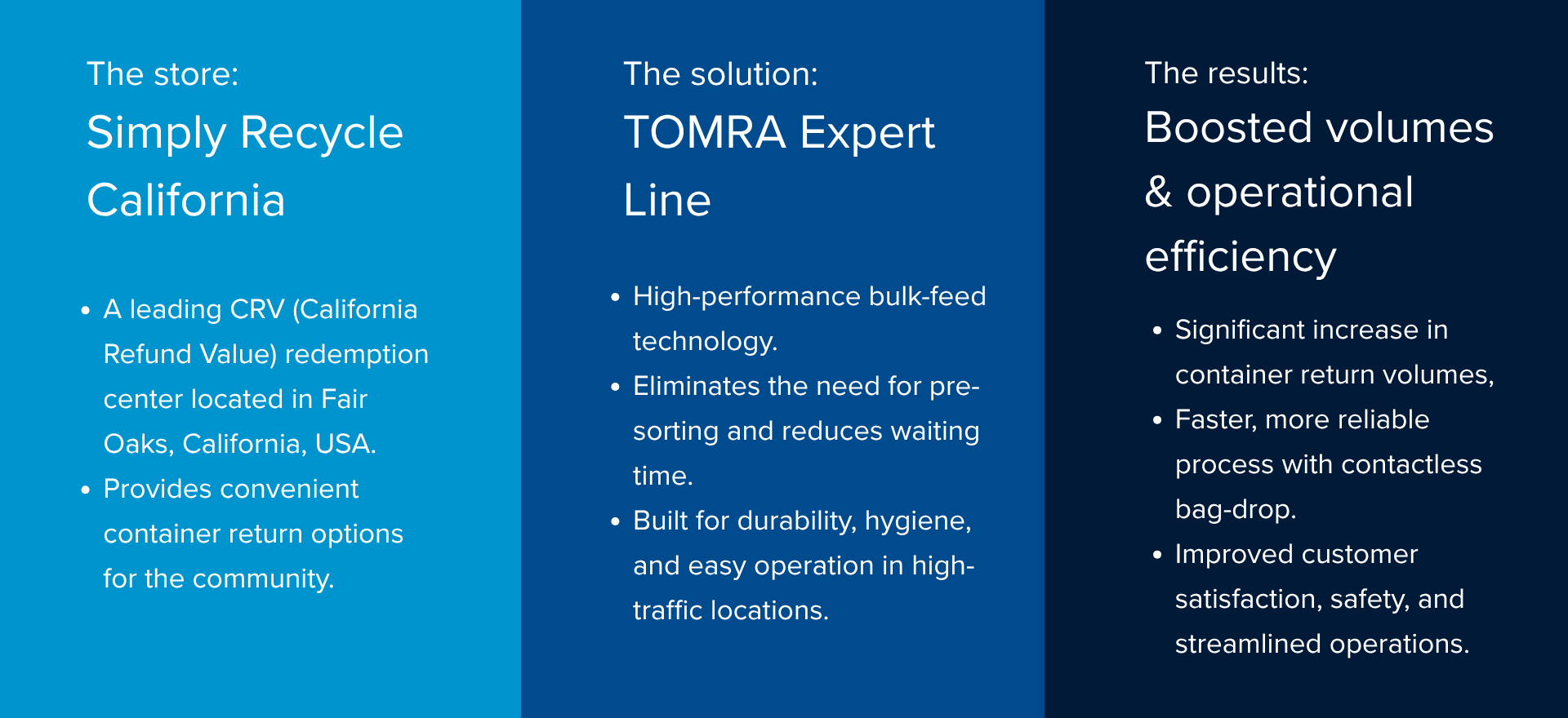 Simply Recycle’s investment in TOMRA’s Expert Line sets a new benchmark for modern CRV redemption centers. By prioritizing automation and customer convenience, the facility has significantly improved the recycling experience while optimizing its operations.