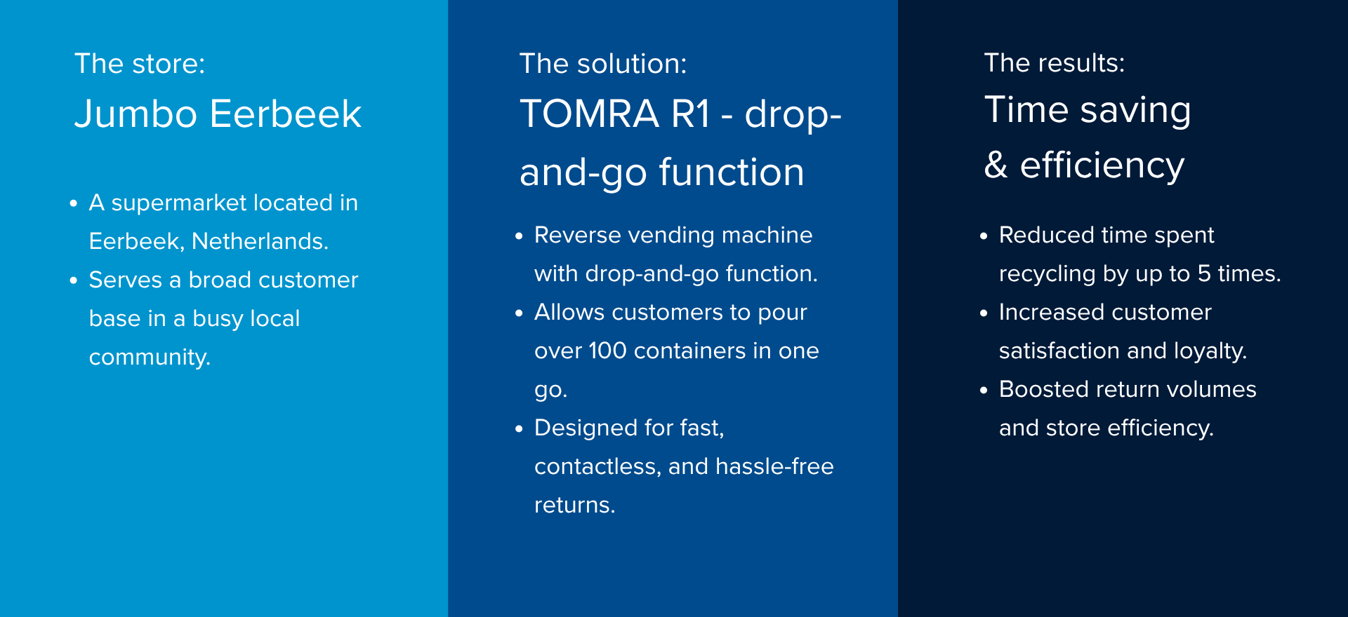 TOMRA R1 offers a more hygienic, efficient, and fast recycling experience when returning deposit containers. Jumbo Eerbeek is the first store in the Netherlands to offer this experience to recyclers. The machine is not only intuitive to use but is up to five times faster than than a traditional reverse vending machine, since beverage containers do not need to be inserted one by one – reducing queues and making the container return experience more convenient.